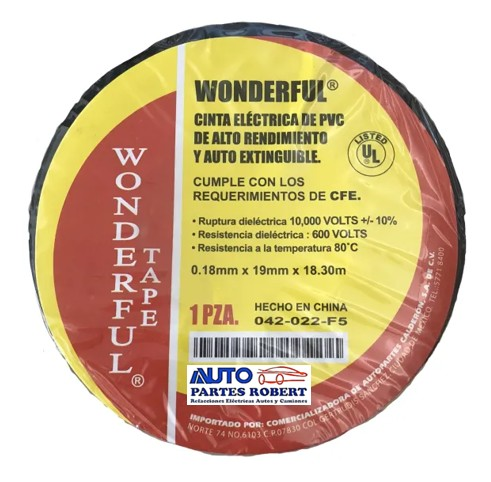 CINTA PLASTICA WINDERFUL PVC DE ALTO RENDIMIENTO 600 VOLTS RESISTE TEMPERATURA 80 C MEDIDA 0.18mm X 19mm X 18.30mt RUCTURA DIELECTRICA 10.000 VOLTS - 10 CONTROL DE CALIDAD UL