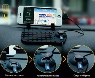 TAPETE BASE SOPORTE CELULAR Y CARGADOR PARA AUTOMOVIL MATERIAL SILICON SUAVE CABLE CARGA DUAL MICRO USBDC V8 IPHONE LIGHTNING DIMENCIONES 25X20X10 CM NO COMPATIBLE CON TURBO CARGADOR 5 VOLTS 1 AMP. LARGO DEL CABLE 1 METRO
